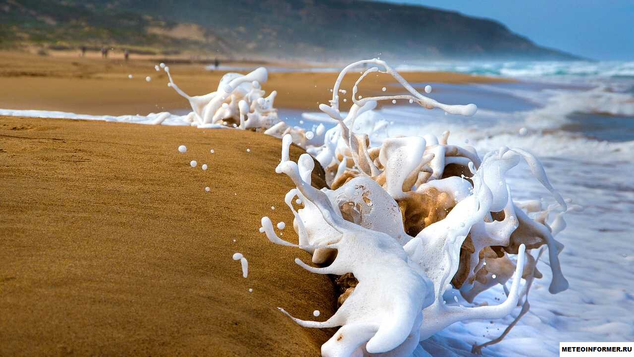 В определенные периоды в некоторых прибрежных районах — например, на Калифорнийском полуострове — морские волны выбрасывают огромное количество пены.